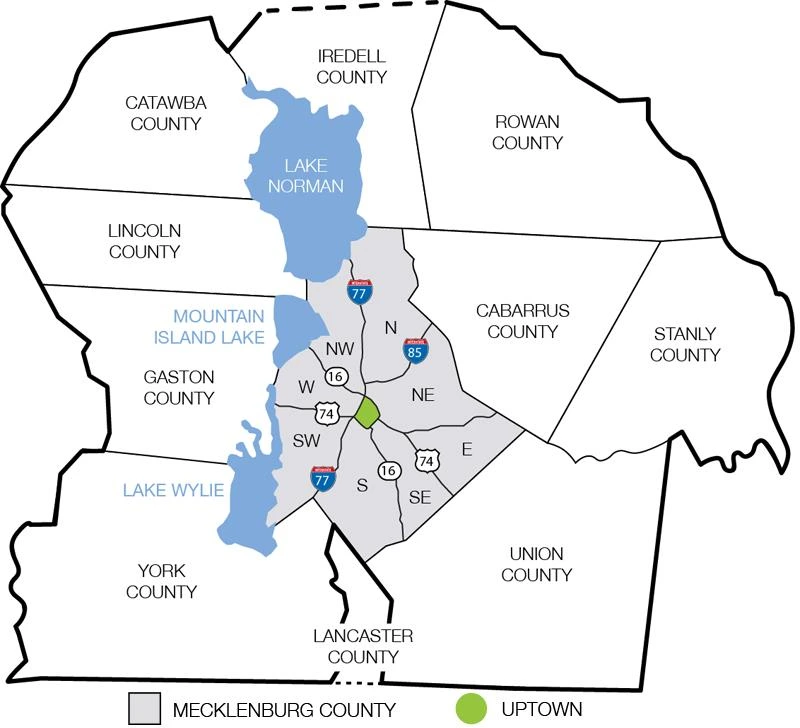 In the Charlotte, NC, area, there are eight counties where most residents reside. The central county of the region is Mecklenburg, which is home to Charlotte and several other popular suburbs like Huntersville, Cornelius, Davidson, Mint Hill, and Matthews. Moving north to the Lake Norman area, you’ll find Iredell County (Mooresville and Statesville) and Lincoln County (Denver). On the eastern side of Charlotte lies Cabarrus County (Concord, Kannapolis, and Harrisburg). To the south and southeast, you’ll discover Union County (Waxhaw, Weddington, Wesley Chapel, and Marvin), which is a highly desirable location. Just south of Ballantyne and extending into South Carolina, there’s Lancaster County (Indian Land, SC), which is experiencing rapid growth. Additionally, there’s booming York County (Fort Mill, Tega Cay, Rock Hill, and Lake Wylie) on the South Carolina side, known for its excellent schools. Finally, on the western side of Charlotte, you’ll find Gaston County (Gastonia, Stanley, and the charming Belmont).