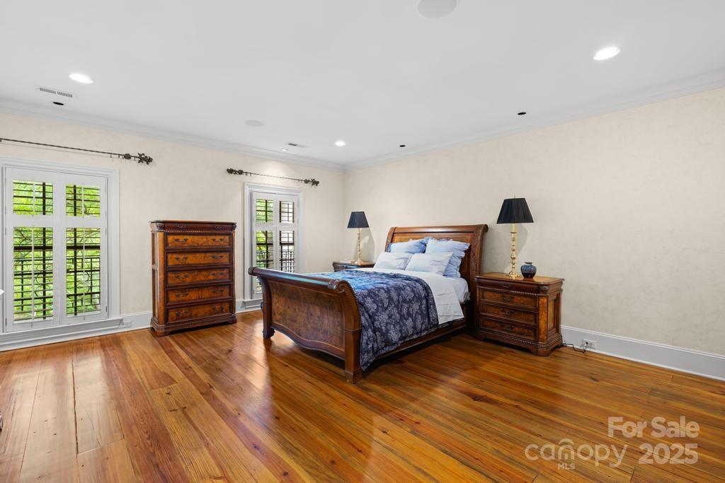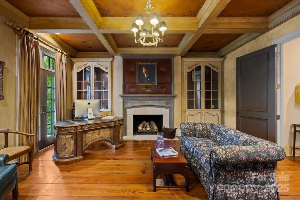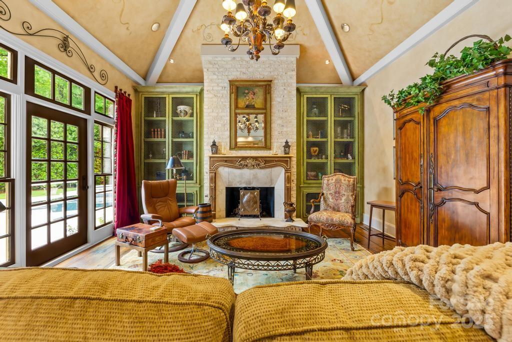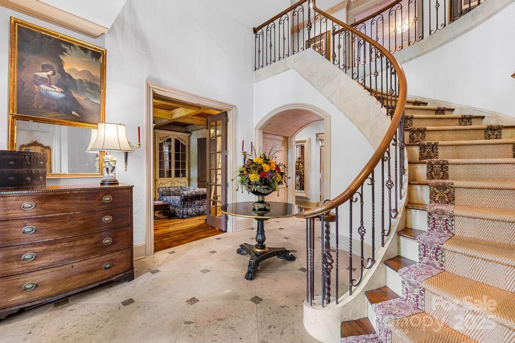Set on an impeccably landscaped lot in gated Morrocroft Estates, this grand Georgian Estate offers timeless architecture, refined interiors, and elevated outdoor living. Gas lanterns line the drive, extending to the four-car garage. A stately columned entry opens to a dramatic foyer with a curved staircase, soaring ceilings, and detailed millwork. The living room features a limestone fireplace and French doors that lead to a private retreat with pool, lawn, and patio. The main level includes a formal dining room, a distinguished library, and a French-inspired kitchen with limestone counters, hearth room and walk-in pantry. Heart pine floors add warmth throughout. The primary suite offers pool access, dual closets, dressing areas, and a spa-like bath. A guest suite also sits on the main floor. Upstairs: three bedrooms, a family room, and billiard room. The third floor offers a theater, gym, and steam shower. Located just minutes from everything the Queen City has to offer.